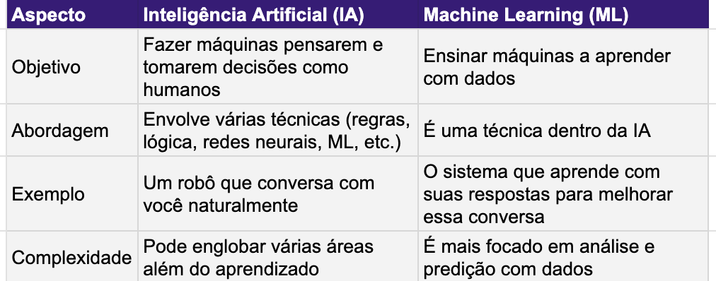 A IA é mais ampla, enquanto o ML é mais específico e técnico.